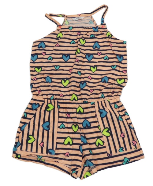 Oranžovo-tmavomodrý pruhovaný kraťasový overal so srdiečkami