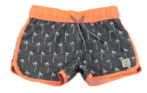 Čierno-bielo-neónově oranžové pruhované plážové kraťasy s palmami