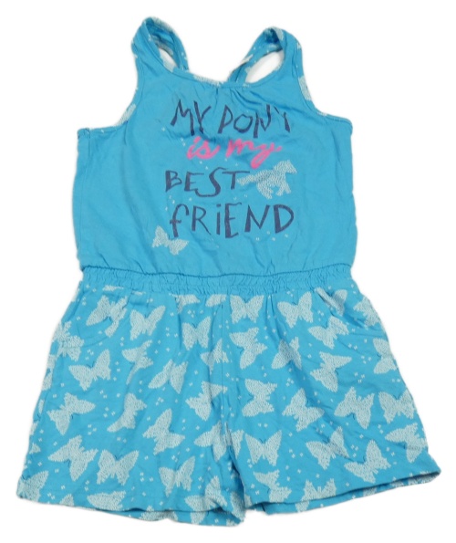 Modrý kraťasový overal s nápisom a obrázkami NKD