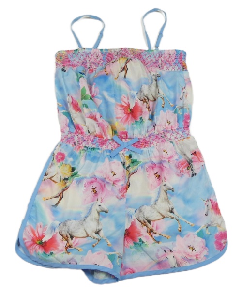Modro-ružový ľahký kraťasový overal s jednorožcami a kvetmi Monsoon