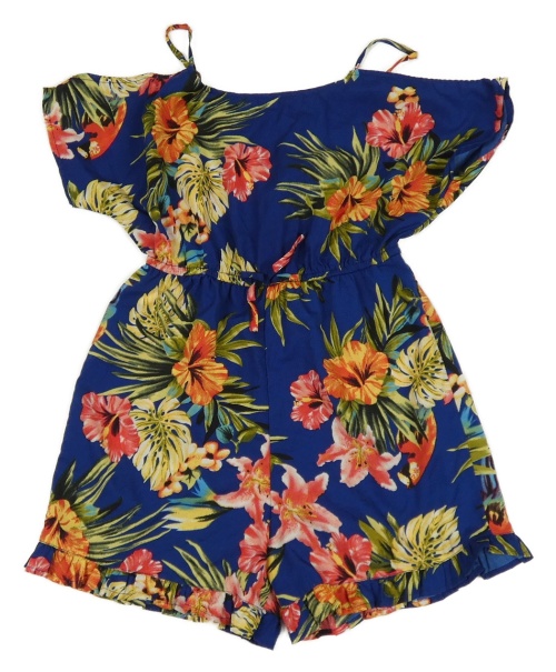 Zafírový kraťasový overal s kvetmi a lístečky a volnými rameny a volánikmi PRIMARK