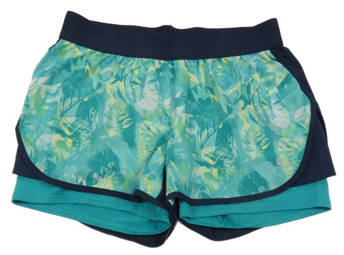 Tyrkysové vzorované športové funkčné kraťasy s všitými elastickými Domyos