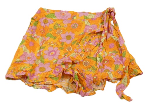 Oranžovo-ružové kvetované kraťasy s opaskom a volánikmi