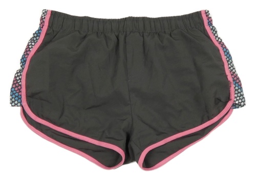 Tmavosivé šušťákové kraťasy so srdiečkami a růžovým lemem