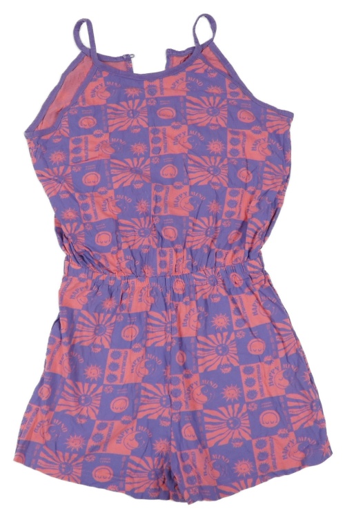 Fialovo-ružový kockovaný bavlnený kraťasový overal so smajlíkmi