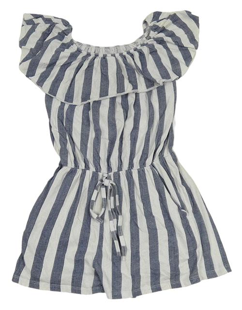 Tmavomodro-biely pruhovaný bavlnený kraťasový overal s volánem