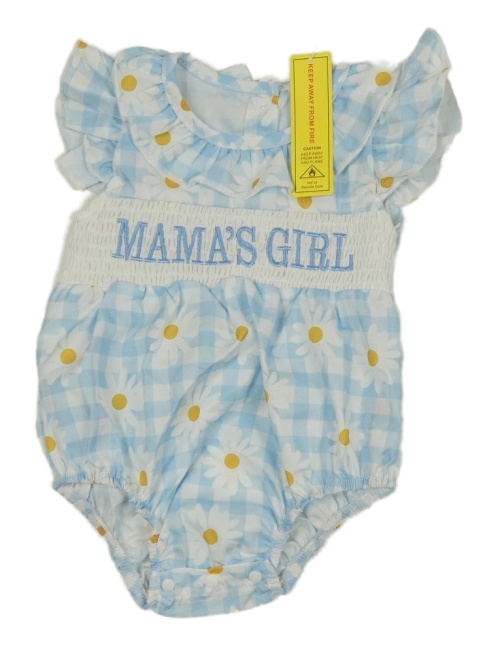 Nové - modro-biely kockovaný kraťasový overal s kopretinami a nápisom a volánikmi
