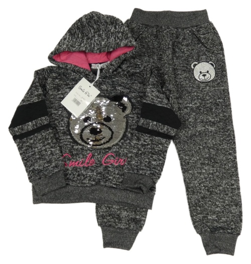 Nové - 2set - Čierno-sivá melírovaná pletená mikina s medvědem z překlápěcích flitrů a kapucí + tepláky