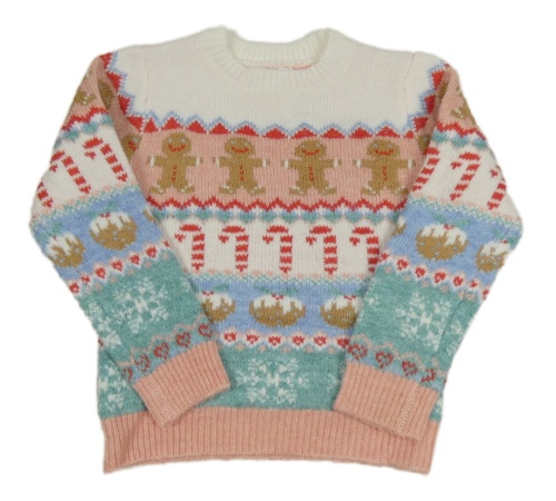 Bielo-ružovo-modro-zelený vzorovaný sveter s obrázkami M&Co.
