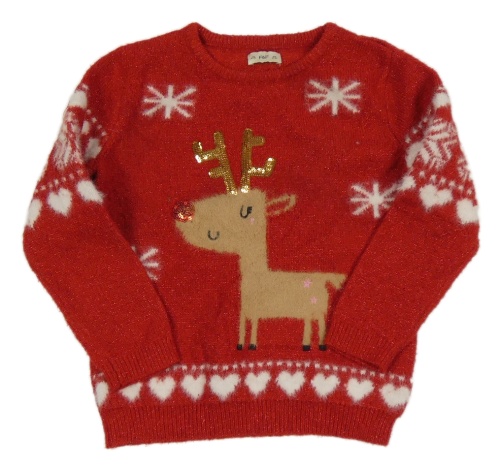 Červený melírovaný sveter so sobom s flitrami a vločkami a srdiečkami a trblietkami F&F