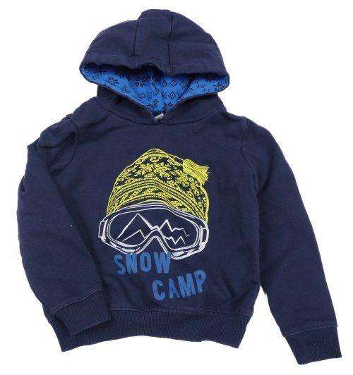 • Tmavomodrá mikina s tištěnou čepicí a lyžiarskými okuliarmi a nápismi a kapucňou lupilu