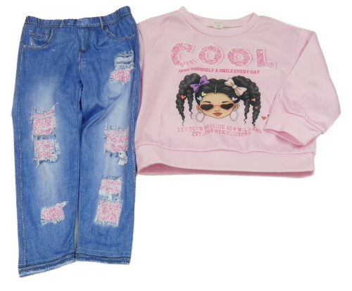 2set - Svetloružová mikina s dívkou + modro-růžové legíny riflového vzhledu Shein
