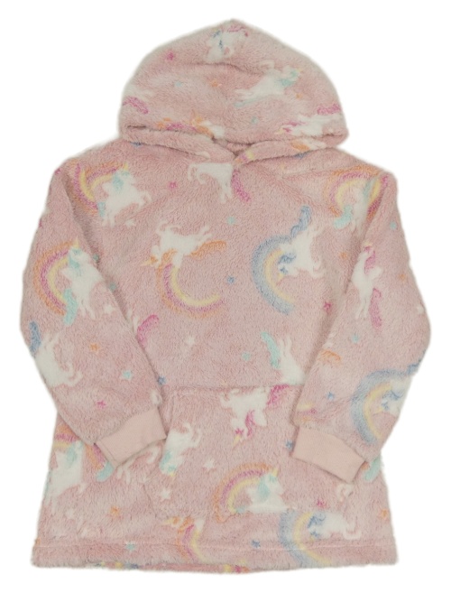 Svetloružová plyšová oversize mikina s jednorožcami a kapucňou