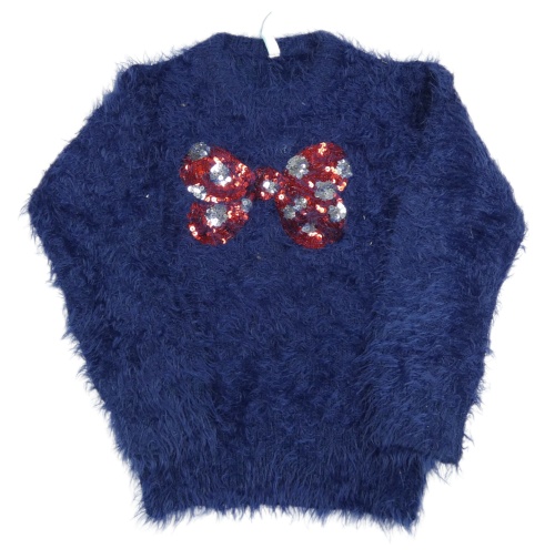 Tmavomodrý chlpatý sveter s mašlí z flitrů
