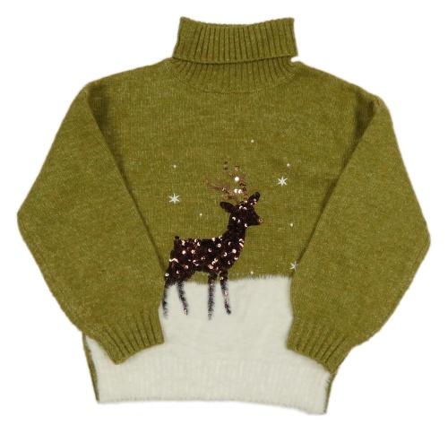 Kaki-biely svetrový rolák so sobem z flitrů Tu