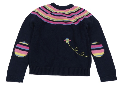 Tmavomodro-ružovo-žltý prepínaci sveter s kvetinami a pruhmi