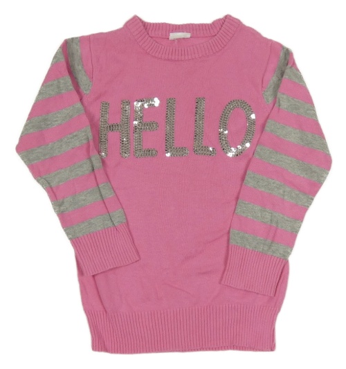 Ružovo-sivý sveter s nápisem z flitrů a pruhy na rukávech