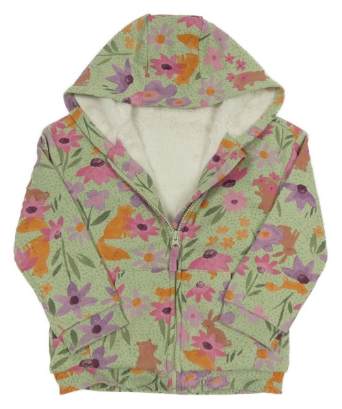 Svetlozelená vzorovaná prepínaci zateplená mikina s kvietkami a zvieratkami a kapucňou Nutmeg