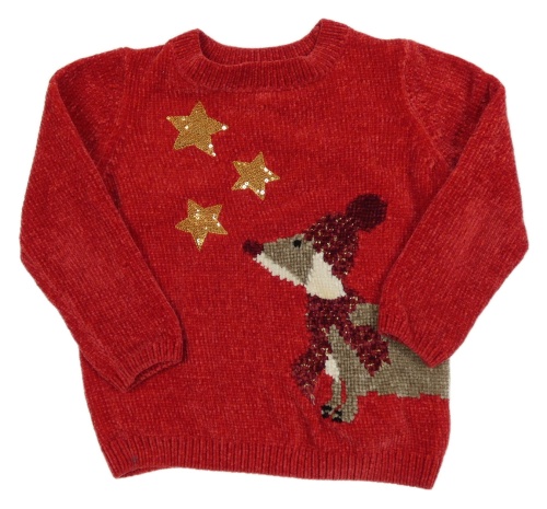 Červený žinylkový sveter so psem a hvězdami z flitrů C&A