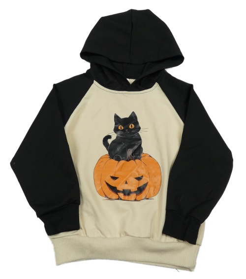Světlebéžovo-čierna mikina s tekvicou a mačičkou a kapucňou