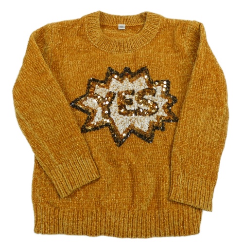 Medový trblietavý žinylkový sveter s nápisem z flitrů