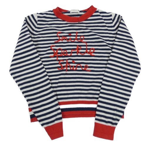 Tmavomodro-bielo-červený pruhovaný crop sveter s nápisom Next