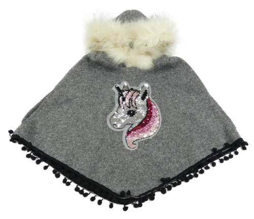 Sivé svetrové pončo s jednorožcem z flitrů a kapucňou s kožešinou