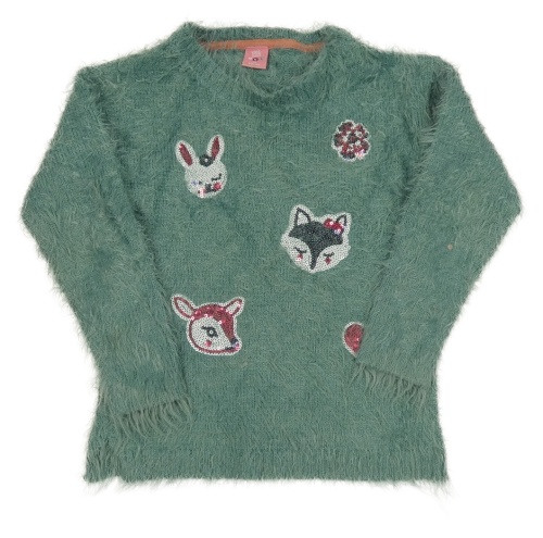 Zelený chlpatý sveter so zvířaty z flitrů Kiki&Koko