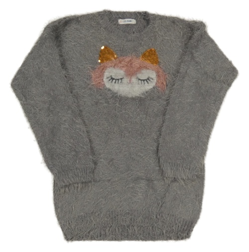 Sivý chlpatý dlhý sveter s líškou a flitrami Cool Club