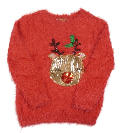 Červený chlpatý sveter so sobem z flitrů Yd.
