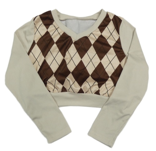 Béžovo-hnedá károvaná rebrovaná crop mikina