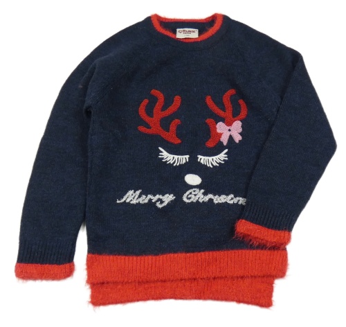 Tmavomodro-červený vlnený sveter so sobom a nápisom