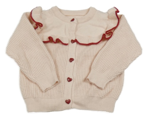 Svetloružová -červený prepínaci sveter s volánikom a srdiečkami