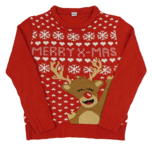 Červený pletený vianočný sveter so sobom a srdiečkami a vločkami