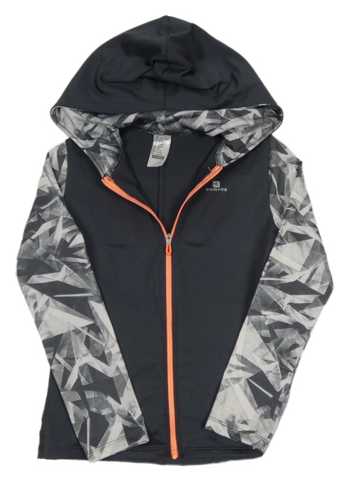 Tmavosivá športová funkčná prepínaci mikina so vzorovanymi rukávy a kapucňou Decathlon
