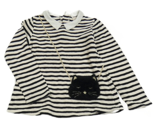 Béžovo-čierna pruhovaná mikina s kabelkou s mačkou a golierikom