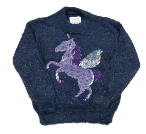 Tmavomodrý chlpatý trblietavý sveter s jednorožcem z flitrů C&A