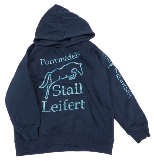 Tmavomodrá mikina s koněm a nápismi a kapucňou