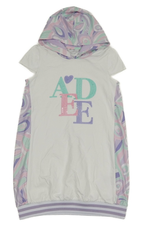Bielo-lila-ružovo-tyrkysová šatová vesta s nápisom a vzorovanou kapucňou