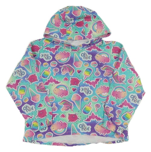 Tyrkysovo-fialová mikina s obrázkami a kapucňou