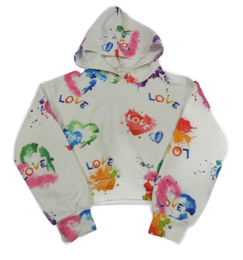 Bielo-farebná skvrnitá crop mikina so srdiečkami a nápismi a kapucňou SHEIN