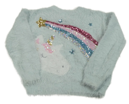 Svetlomodrý chlpatý sveter s jednorožcom a duhou z flitrů F&F