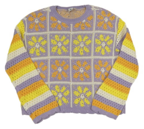 Lila-oranžovo-žltý kvietkovany ažurový sveter TU
