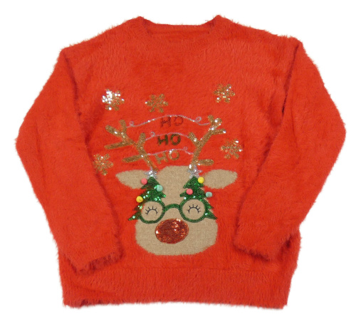Červený chlpatý sveter so sobom a flitrami St. Bernard