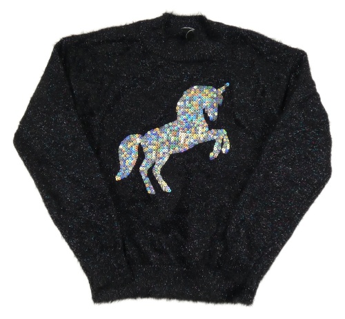 Čierno-farebný chlpatý trblietavý sveter s jednorožcom