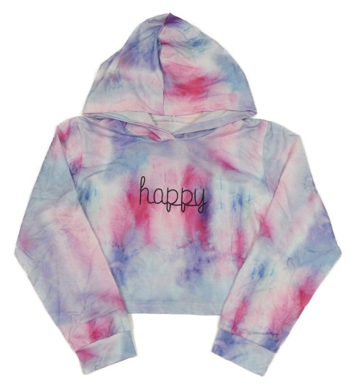 Ružovo-modro-biela batikovaná crop mikina s nápisom a kapucňou