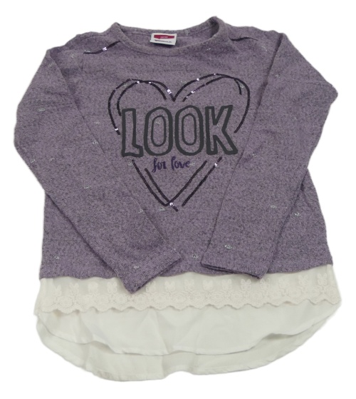 Fialový ľahký sveter s nápisem z flitrů a čipkou Yigga