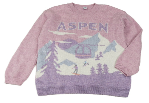 Ružovo-bielo-fialový melírovaný sveter s lanovkou a lyžaři Tu