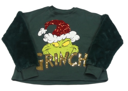 Tmavozelená mikina s Grinchem a chlpatymi rukávy