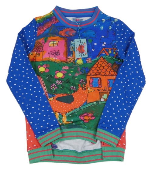 Nové - Modro-červeno-zelená mikina s domky a kvetmi
